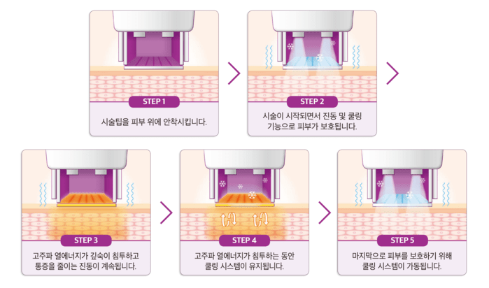 피부 표면 손상 없이 진피층과 피하층까지 에너지를 전달하여 처진 피부를 타이트닝하고 윤곽을 또렷하게 만드는 것이 특징입니다.