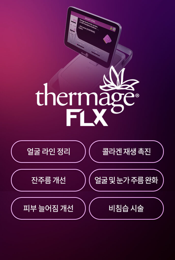써마지 FLX는 고주파(RF) 에너지를 피부 깊숙이 전달해 콜라겐 재생을 유도하고 피부 탄력을 개선하는 프리미엄 레이저 리프팅 시술입니다.